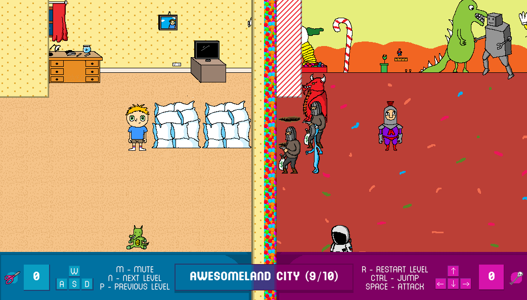 You control Billy and his favorite hero, Sir Awesome Man. Careful, though - the child and the hero are connected!